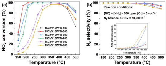 The impact of various calcination temperatures on the catalytic performance of 15CeV10W/Ti catalysts was further explored, as shown in Figure 5. Both the 15CeV10W/Ti-500 and 15CeV10W/Ti-400 catalysts exhibited similar low-temperature NOx conversion and N2 selectivity. However, the 15CeV10W/Ti-500 catalyst demonstrated higher activity at temperatures above 400 °C, likely due to a greater number of acid sites. As the calcination temperature increased to 600 °C and 700 °C, the low-temperature activity gradually declined while the high-temperature activity improved. Furthermore, increasing the calcination temperature to 900 °C significantly reduced the low-temperature activity and increased N2O production (as shown in the inset of Figure 5b), which resulted in a narrower effective temperature range, with NOx conversion exceeding 90% only between 350 °C and 450 °C. This decline in activity can be attributed to a reduction in active sites and acidity, as confirmed by H2-TPR, XPS, and NH3-TPD analyses. Consequently, the 15CeV10W/Ti-500 catalyst was found to possess superior NH3-SCR activity and was selected for subsequent studies on synergistic catalytic of NOx and CB.