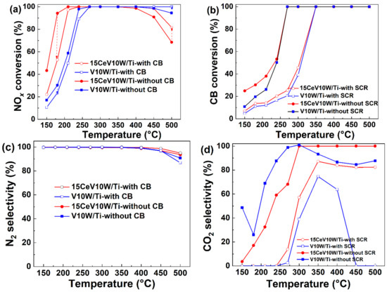 The catalytic performance of 15CeV10W/Ti catalysts for the simultaneous removal of NOx and CB was examined, as illustrated in Figure 6. The commercial V10W/Ti catalyst was used as a comparison. The 15CeV10W/Ti catalyst demonstrated superior NH3-SCR activity and CBCO activity. However, the presence of CB reduced low-temperature NOx conversion during the MPC reaction, with NOx conversion at 180 °C dropping from 30% and 94% for V10W/Ti and 15CeV10W/Ti, respectively, to 23% and 53%. On the other hand, CB enhanced the high-temperature NH3-SCR activity for both catalysts, likely due to the inhibition of unselective oxidation of NH3 by CB [29]. As a result, in the MPC reaction, the NOx conversion for 15CeV10W/Ti approached 100% within the temperature range of 210–450 °C.