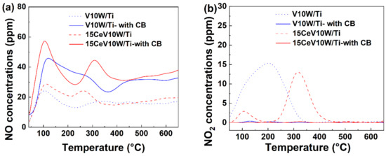 Desorption of (a) NO and (b) NO2 from NO + O2-TPD and NO + O2 + CB-TPD over V10W/Ti and 15CeV10W/Ti catalysts.
