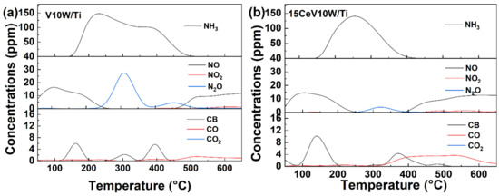 TPSR curves of (a) V10W/Ti and (b) 15CeV10W/Ti catalysts.