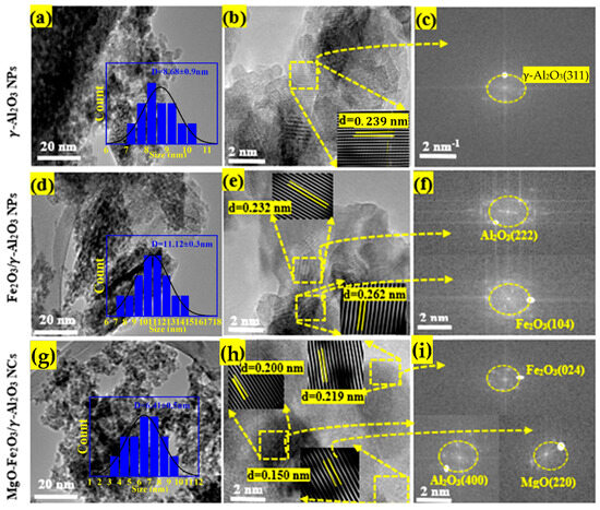 TEM images, HRTEM images, and SAED analysis: (a–c) -Al2O3 NPs, (d–f) Fe2O3/-Al2O3 NPs, and (g–i) MgO-Fe2O3/-Al2O3 NCs.