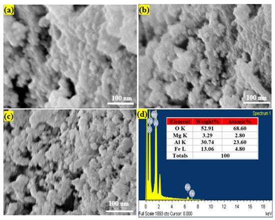 SEM images: (a) -Al2O3 NPs, (b) Fe2O3/-Al2O3 NPs, (c) MgO-Fe2O3/-Al2O3 NCs, and (d) EDX analysis of MgO-Fe2O3/-Al2O3 NCs.
