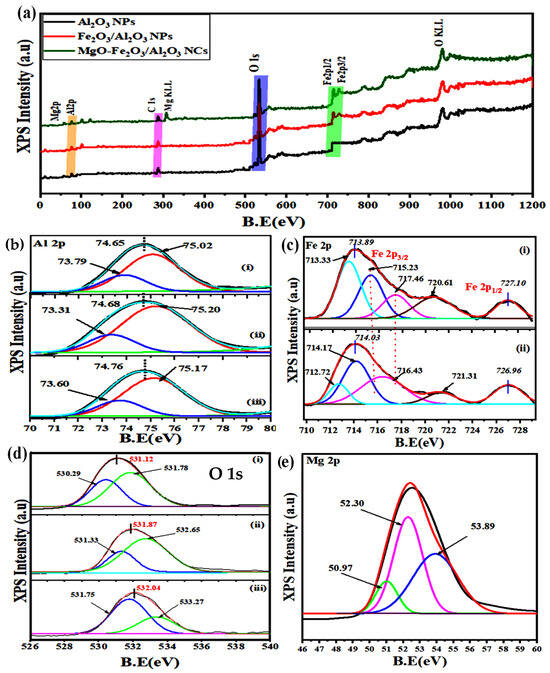 The chemical compositions and oxidation states of the samples were investigated using XPS analysis. Figure 5a–e display the XPS spectra of the pure -Al2O3 NPs, Fe2O3/-Al2O3 NPs, and MgO-Fe2O3/-Al2O3 NCs. The XPS survey spectra (Figure 5a) confirmed that the peaks corresponding to the chemical compositions of Al, Fe, Mg, and O were present in the prepared sample. Furthermore, the high-resolution XPS spectra of Al 2p, Fe 2p, O 1 s, and Mg 2p are presented in Figure 5b–e, respectively. In Figure 5b(i), the binding energy (B. E) of the pure -Al2O3 NPs is associated with 73.76 eV, 74.65 eV, and 75.02 eV for Al 2p, while the XPS peaks of the Al 2p of the MgO-Fe2O3/-Al2O3 NCs (Figure 5b(ii)) were assigned at 73.60 eV, 74.68 eV, and 75.20 eV, respectively, in agreement with previous studies [58,59]. In comparison, the B. E of the Al 2p peak in the prepared sample is slightly shifted. Similarly, the binding energy (B. E) of Fe 2p in the Fe2O3/-Al2O3 NPs (Figure 5c(i)) at 723.33 eV, 715.23 eV, 717.46 eV, 720.61 eV, and 727.10 eV are observed, while they associated with 712.72 eV, 714.17 eV, 716.43 eV, 721.31 eV, and 726.96 eV for the MgO-Fe2O3/-Al2O3 NCs (Figure 5c(ii)). These values are in good agreement with these previous investigations [59,60,61]. As observed in the shift in the B.E value of Fe 2p, there is a strong interaction between Fe2O3 and the -Al2O3 NPs. Additionally, the oxygen vacancies of the prepared NPs and NCs were determined through XPS analysis for O 1s. Figure 5d(i) shows that the O 1s peak in the -Al2O3 NPs at 530.29 eV and 531.78 eV is due to the C–O–C and C=O bonds, respectively [62]. The B.E values of the O 1s peak shifted to 531.75 eV and 533.27 eV, respectively. Moreover, the XPS peaks corresponding to the Mg 2P peak in the MgO-Fe2O3/-Al2O3 NCs are shown in Figure 5e. We revealed that the B. E values of the Mg 2p peak at 50.93 eV, 52.30 eV, and 53.89 eV are attributed to the Mg–O band as compared with these studied [63,64]. XPS results confirmed structural insights into the prepared samples, emphasizing the importance of understanding these shifts in peak positions for use in photocatalytic and medical applications.