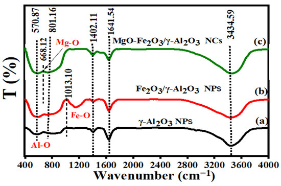 Figure 6a–c shows the FTIR spectra of the pure -Al2O3 NPs, Fe2O3/-Al2O3 NPs, and MgO-Fe2O3/-Al2O3 NCs. The absorption bands in Figure 1a–c for all the samples were located at 570.87 cm−1 and 801.16 cm−1, which correspond to the characteristic stretching vibrations of the Al-O bonds in -Al2O3, as reported in these studies [62,65,66]. In agreement with Khodadadi et al., FTIR analysis of -Al2O3 has exhibited absorption bands at 580 cm−1 and 802 cm−1, corresponding to octahedral AlO6 and tetrahedral AlO4 sites. The characteristic stretching vibrations of Fe-O and Mg-O are associated with 1013.10 cm−1 and 668.12 cm−1, respectively. Nevertheless, the broad bands in Figure 6a–c for the prepared NPs at 1641.54 cm−1 and 3434.59 cm−1 are due to the O-H vibration and stretching of surface hydroxyl groups, respectively [67]. Additionally, the band at 1402.11 cm−1 in these samples represents the C-O stretching band. In contrast, the intensity of the band between 400 cm−1 and 800 cm−1 for the prepared NPs and NCs increased owing to the addition of the stretching vibrations of Fe-O and Mg-O bonds [68]. This phenomenon confirmed the presence of MgO and Fe2O3 phases within -Al2O3 [69,70]. FTIR results highlighted the synergistic interactions between MgO, Fe2O3, and -Al2O3 in the nanocomposite structure, as reported in the XRD and XPS results (Figure 1 and Figure 5).