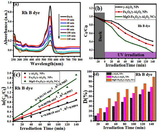 Figure 8a and b illustrate the results of the photocatalysis of Rh B dye under direct UV light for an exposure time of 140 min. Nevertheless, the decrease in the UV absorption (Figure 8a) of the Rh B solution using the MgO-Fe2O3/-Al2O3 NCs was attributed to the decreased recombination rate between the electron (e−)–hole (h+) pairs. As shown in Figure 8c, the constant rate for pure -Al2O3 NPs, Fe2O3/-Al2O3 NPs, and MgO-Fe2O3/-Al2O3 NCs were used for Rh B photocatalysis were 0.00618 min−1, 0.00798 min−1, and 0.01193 min−1, respectively. Additionally, the -Al2O3 NPs, Fe2O3/-Al2O3 NPs, and MgO-Fe2O3/-Al2O3 NCs (Figure 8d) achieved degradation efficiencies (%) of 56.3%, 69.2%, and 87.5%, respectively, as illustrated in Table 1.