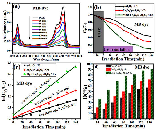 At the same experimental conditions, the results of photocatalytic degradation of MB dye under UV irradiation for 140 min using prepared samples are shown in Figure 9a–d. Similarly, the UV-vis absorption spectra of the MB dye solution around 664 nm (Figure 9a) show the degradation behavior under photocatalytic activity. As observed in Figure 9a, the UV absorption of MB solution degradation for MgO-Fe2O3/-Al2O3 NCs was decreased with increasing exposure time. This indicates that prepared MgO-Fe2O3/-Al2O3 NCs have excellent ability to degrade organic pollutants. In Figure 9b, the plot of Ct/C0 vs. irradiation time displays the relative concentration of MB dye (Ct) at any time (t). The kinetic analysis in Figure 9c illustrates the pseudo-first-order kinetics of the photocatalysis process. The constant rate of MB degradation of samples was 0.00598 min−1, 0.00876 min−1, and 0.01574 min−1, respectively. The linearity of the plot (Figure 9c) provides a quantitative measure of the degradation speed. However, the kinetic constant rate (K) of the photocatalysis of MB dye is shown in Table 1. The photocatalysis efficiency (D%) of the synthesized samples is illustrated in Figure 9d. As presented in Table 1, the degradation efficiencies of MB by the synthesized -Al2O3 NPs, Fe2O3/-Al2O3 NPs, and MgO-Fe2O3/-Al2O3 NCs were 57.3%, 71.7%, and 90.4%, respectively, after 140 min. These values indicate the ability of the catalyst to degrade MB dye under UV exposure efficiently. A comparison of the degradation efficiencies of different dyes with those reported by various catalysts is presented in Table 2. In summary, the synthesized MgO-Fe2O3/-Al2O3 NCs revealed a high degradation efficiency of Rh B (87.5%) and MB dyes (90.4%) under UV irradiation. These results confirm that supporting MgO and Fe2O3 to -Al2O3 as NCs enhanced the photocatalysis of the polluting dye.