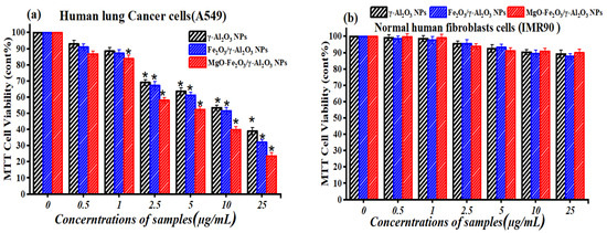 The percentage of viable cells after exposure to the -Al2O3 NPs, Fe2O3/-Al2O3 NPs, or MgO-Fe2O3/-Al2O3 NCs after 24 h: (a) A549 cells and (b) normal IMR90 cells. The symbol (*) indicates a significant difference (p < 0.05) between the treated sample and the control.