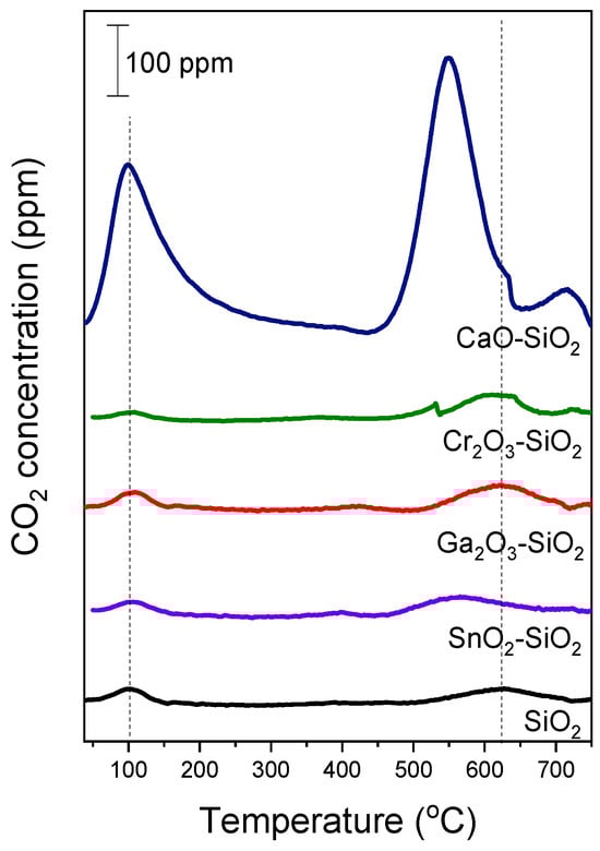 CO2-TPD profiles obtained from SiO2-based catalysts. Experimental conditions: mass of catalyst: 0.15 g; heating rate β = 10 °C /min; total flow = 40 cm3 min−1.