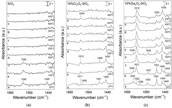 Adsorption of pyridine on Cr2O3-SiO2 catalyst at 25 °C (Figure 2b, trace a) gave rise to three IR bands associated with Lewis acid sites (1611, 1599 and 1450 cm−1) and the characteristic band at 1491 cm−1 associated with both Lewis and Brønsted acid sites [,,,,,,]. Although most bands disappeared from the spectra obtained above 250 °C, the one detected at 1611 cm−1 could be discerned up to 400 °C, confirming the above suggestion that this band is related to strong Lewis acid sites. Interestingly, the population of adsorbed pyridine species was significantly higher over Ga2O3-SiO2 (Figure 2c) catalyst in the entire temperature range examined. Bands owing to (a) pyridine adsorption on strong and weak/moderate Lewis acid sites (1622, 1598, 1491 and 1459 cm−1), (b) pyridine protonated by Brønsted acid sites (1640, 1550 and 1491 cm−1) and (c) physisorbed pyridine (1444 cm−1) were present in the spectrum collected at 25 °C [,,,,,,]. Heating of catalyst in He flow resulted in an increase in the relative intensity of bands attributed to strong Lewis acid sites (1622 and 1459 cm−1) that were present in the spectra obtained up to 450 °C (trace i), implying that the corresponding species were thermally stable. This was also the case for the characteristic band containing contributions from both Lewis and Brønsted acid sites (1491 cm−1), which, although, decreased in intensity, could be clearly observed at temperatures as high as 450 °C (trace i). In contrast, pyridine species associated with Brønsted acid sites could not be discerned above 300 °C (trace f), while the band due to a weak/moderate Lewis acid site (1598 cm−1) disappeared already at 100 °C (trace b).