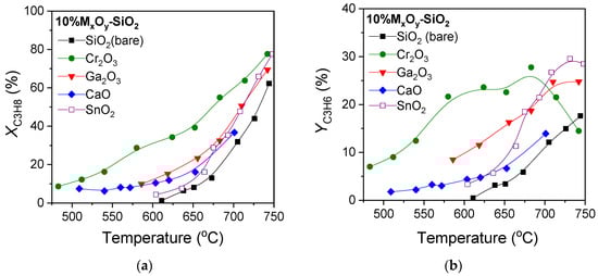 Effect of reaction temperature on the (a) conversion of propane and (b) propylene yield obtained over SiO2 and 10%MxOy-SiO2 catalysts. Experimental conditions: particle diameter: 0.15 < dp < 0.25 mm; CO2:C3H8 = 5:1; WGHSV = 6000 h−1.