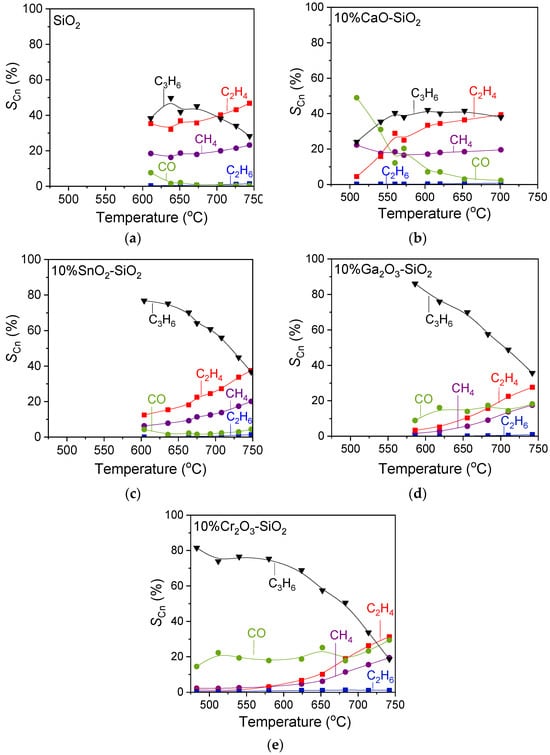 The variation in product selectivity with temperature for the investigated metal oxides is presented in Figure 4. Propylene, carbon monoxide, methane, ethylene and traces of ethane were detected for all the examined catalysts. In the case of bare SiO2 (Figure 4a), the selectivity towards C3H6 () was slightly increased from 38 to 50% upon increasing temperature from 610 to 638 °C, but it was significantly reduced to 29% with a further increase in temperature to 740 °C. Carbon monoxide production implies that the desired reactions of oxidative dehydrogenation of propane with CO2 (2) and RWGS (3) were operable under the present experimental conditions, whereas part of CO may be also produced via the reverse Boudouard reaction (4). However, the selectivity towards CO () was generally low and decreased from 7.6 to 0.3% in the temperature range of 610–740 °C. This indicates that the CO2-ODP reaction was probably limited and that the direct dehydrogenation of propane prevailed above 670 °C, where was lower than 1%. The selectivities towards CH4 (), and C2H4 () were generally high and increased slightly from 18 to 23% and from 35 to 46%, respectively, with increasing temperature from 610 to 740 °C. A small increase was also observed for the C2H6 selectivity (), which was always lower than 1.3% under the present experimental conditions. Results imply that the C3H8 hydrogenolysis as well as the C3H8 and/or C3H6 decomposition were favored at high reaction temperatures, in agreement with previous studies [,,].