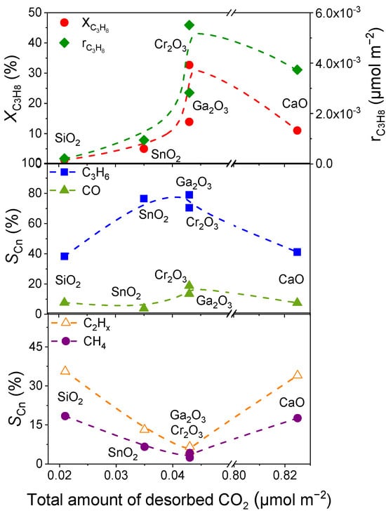 Based on the results shown in Figure 1, Figure 3 and Figure 4, a similar trend was found to be followed for the MxOy-SiO2 catalysts of the present study. This can be clearly seen in Figure 5, where the propane conversion, the reaction rate normalized with respect to the SSA (, in μmol m−2), and the selectivities towards reaction products measured at 610 °C are plotted as a function of the total amount of desorbed CO2 during CO2-TPD experiments for all the investigated catalysts. As can be seen, both the propane conversion and the reaction rate increased with increasing surface basicity, taking a maximum value for the Cr2O3-SiO2 catalyst, and then decreased for the CaO-SiO2 sample, which exhibited significantly higher surface basicity (Figure 5). It is of interest to note that, although the Ga2O3-SiO2 catalyst exhibited surface basicity similar to that of Cr2O3-SiO2 catalyst, its propane conversion and reaction rate were lower. This may imply that additional physicochemical characteristics also affect the rate of C3H8 conversion to C3H6. Selectivities towards C3H6 and CO followed the same trend with that of reaction rate, i.e., they presented a maximum value for the samples characterized by moderate surface basicity (Figure 5). Specifically, Ga2O3-SiO2 catalyst was the most selective towards propylene, whereas Cr2O3-SiO2 catalyst was the most selective towards CO. On the other hand, and went through a minimum value for the Ga2O3-SiO2 and Cr2O3-SiO2 catalysts (Figure 5), indicating that moderate surface basicity led to elimination of the undesired reactions.