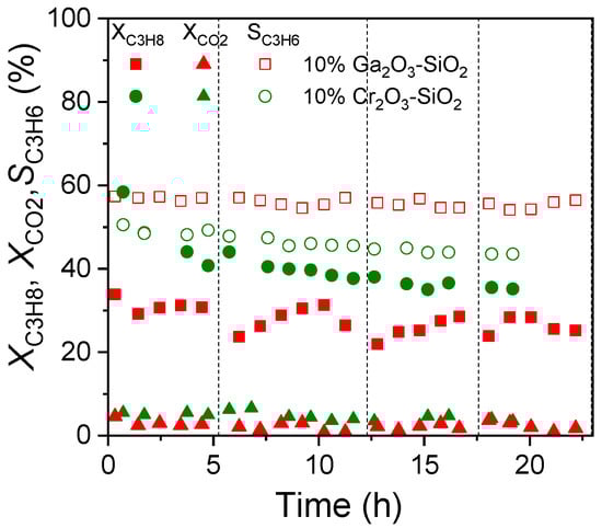 Regarding the stability of the catalysts investigated in the present work, time on stream (TOS) stability tests were carried out over the most active Cr2O3-SiO2 and Ga2O3-SiO2 catalysts at 660 °C. In these experiments, the catalyst remained under He flow every night after completion of 5–6 h interaction with the reaction mixture (as indicated with the dashed vertical lines). Results showed that Ga2O3-SiO2 catalyst exhibited sufficient stability for 22 h on stream, with and taking values of 24–31% and 54.5–57%, respectively (Figure 6). The small decrease in observed after the shutdown of the system overnight indicates that Ga2O3-SiO2 catalyst lost part of its initial activity, which, however, could be regained following its exposure to the reaction mixture. Interestingly, selectivity towards C3H6 was not affected by this slight decrease in . Regarding Cr2O3-SiO2 catalyst, a decrease in from 58 to 40.5% was observed during the first 5 h on stream; this did not practically influence propylene selectivity, which varied between 49.2–50.5%. Further catalyst operation under CO2-ODP conditions led to a smaller decrease in propane conversion, reaching 35%, which was followed by a slight decrease in from 49 to 43.5% after ~20 h on stream. Since CO2 was in excess concentration (25%), the conversion of CO2 was generally low for both catalysts examined, taking slightly higher values ( = 3.5–6.6%) for Cr2O3-SiO2 compared to Ga2O3-SiO2 ( = 1.6–4.3%).