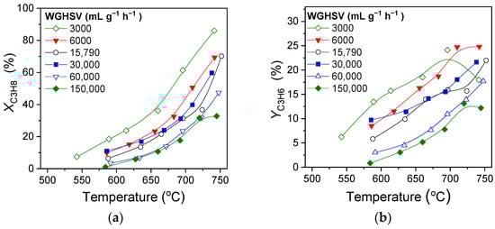 Results presented in Figure 3, Figure 4, Figure 5 and Figure 6 were obtained using a WGHSV of 6000 mL g−1 h−1. In an attempt to optimize the operating reaction conditions, the effect of WGHSV on catalytic performance was investigated over the 10%Ga2O3-SiO2 catalyst, which as shown above, was among catalysts exhibiting high activity and propylene selectivity as well as sufficient stability. In these experiments, the WGHSV was varied in the range of 3000–150,000 mL g−1 h−1 using a molar ratio of CO2:C3H8 = 5. It should be mentioned that the WGHSV = 3000 mL g−1 h−1 was achieved using Ga2O3-SiO2 catalyst in the form of pellets so as to reduce the catalyst volume and study the effect of space velocity over a wider range. Results obtained are shown in Figure 7 where the effect of WGHSV on the conversion of propane (Figure 7a) and propylene yield (Figure 7b) are plotted as a function of reaction temperature. It was observed that both the propane conversion and propylene yield curves were progressively shifted towards lower temperatures ( by ~93 °C and by ~137 °C) with decreasing WGHSV from 150,000 to 3000 mL g−1 h−1. In particular, and at 650 °C increased from 9 to 35% and from 4.5 to 18%, respectively, as WGHSV decreased from 150,000 to 3000 mL g−1 h−1.