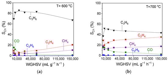 Effect of WGHSV on the selectivities towards reaction products over 10%Ga2O3-SiO2 catalyst at (a) 600 and (b) 700 °C using a CO2:C3H8 = 5:1.