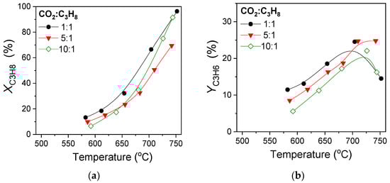 Effect of CO2:C3H8 molar ratio on the (a) conversion of C3H8 and (b) yield of C3H6 over 10%Ga2O3-SiO2 catalyst using a WGHSV = 6000 h−1.