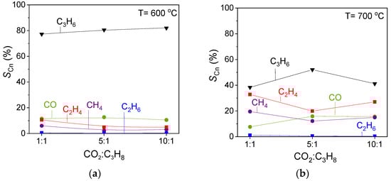 Results for product distribution with temperature obtained for the three CO2:C3H8 molar ratios investigated are presented in Figure S5, where only small differences can be observed by increasing the CO2 content in the gas stream and seem to depend on the reaction temperature. These differences can be better seen in Figure 10, where the selectivities towards reaction products were plotted as a function of the CO2:C3H8 molar ratio at 600 and 700 °C. A small increase in from 77 to 82% by increasing the CO2:C3H8 molar ratio from 1:1 to 10:1 was observed at 600 °C, which was accompanied by a decrease in and from 6 to 3% and from 11 to 4.5%, respectively, while and remained practically unchanged (Figure 10a). On the other hand, and measured at 700 °C were optimized for CO2:C3H8 = 5:1 at 52 and 16%, respectively, at which (12%) and (20%) were minimized (Figure 10b).