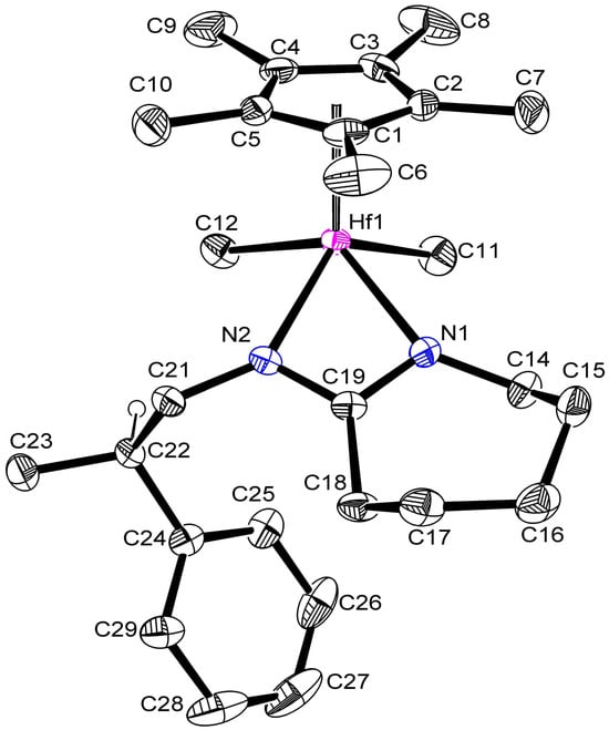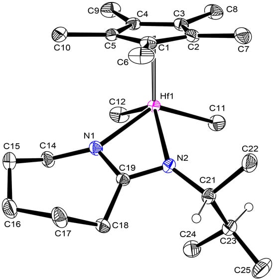 Single crystals of 2 were obtained by crystallization from a mixed hydrocarbon (toluene/pentane) solution at a low temperature of −30 °C. Figure 1 provides geometric parameters for the solid-state molecular structure of 2 as obtained through single crystal X-ray analysis. As expected, only a single diastereomer is observed within the unit cell, and based on standard convention for assigning the absolute configuration of chiral piano-stool metal complexes, the structure shown in Figure 1 is for (RC, RHf)-2, which is in keeping with the previously reported (RC, RHf)-1 diastereomer [,,,,]. There is an asymmetry in the two Hf-N bond distances [cf. Hf1-N1 2.226(3) Å and Hf1-N2 2.257(3)] and a large difference in the sum of the bond angles around each nitrogen atom [cf. 355.34° for N1 and 358.60° for N2], which suggests that N2 has a weaker, dative bonding interaction and N1 has a stronger covalent bonding interaction with the hafnium metal center. The larger Hf1-N2-C21 bond angle of 142.5(2)° vis-à-vis the Hf1-N1-C14 bond angle of 138.6(2)° also suggests that more steric congestion due to non-bonded steric interactions with the C11 methyl group exists relative to the more sterically open side of the C12 methyl group position. Finally, it is interesting to note that the C23-C24-C25 ‘isopropyl’ fragment of the N-(R)-3-methyl-2-butyl substituent is located in a similar spatial position as the phenyl group of the N-(R)-1-phenylethyl substituent of (RC, RHf)-1, and this suggests that the Ph to isopropyl group replacement has caused little steric disruption in the overall favored geometry in going from 1 to 2.