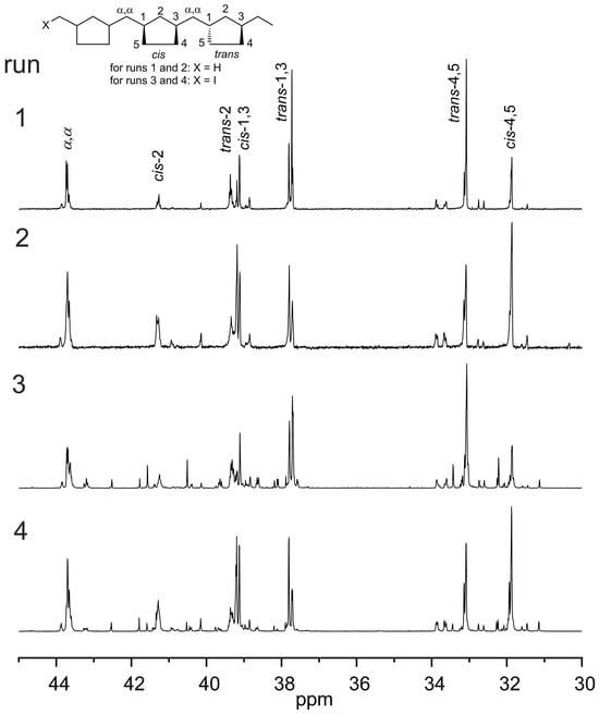 Table 1 presents details of the characterization data for all the new PMCP materials as obtained by 1H and 13C NMR (800 and 200 MHz, respectively, 1,1,2,2-tetrachloroethane-d2, 110 °C) spectroscopy for microstructural information, gel permeation chromatography (GPC) for determination of molar mass indices and dispersity, and differential scanning calorimetry (DSC) for glass transition and melt transition temperatures, Tg and Tm, respectively. These data are consistent with the living character of coordination polymerizations conducted using CPAM complexes as pre-initiators in both the absence and presence of chain transfer agents [,,,,,,,]. We have also observed larger dispersity values when employing enantiopure and configurationally stable CPAM initiators, which we believe is the manifestation of a reversible equilibrium involving uncomplexed and complexed propagators due to increased steric interactions about the metal center by the bulky chiral N-substituent. 1H NMR spectra are consistent with that expected for PMCP, and these reveal the presence of a small amount (e.g., 0.5% to 1%) of pendant ω-butenyl side chains that originate from failure of the monomer to cyclize following initial 1,2-MI (see Figure 1). Figure 3 presents the partial 13C NMR spectra for the PMCP samples in which differences in the stereochemical microstructures are clearly evident. The most notable difference is the large increase in the formation of trans-1,3-cyclopentane units for the ring-closing step of propagation in PMCP obtained from (RC, RHf)-2 vs. (SC, SHf)-3 (cf. 70.4% vs. 41.1%, respectively) [,,,,,,,,,,,,,,,,,,,,,,,,,]. A more thorough investigation of differences in the stereochemical microstructure arising from differences in the degree of stereoregularity for the 1,2-MI step has not been performed. In keeping with prior observations by us and others, PMCP with a number-average molar mass index, Mn ≥ 10 kDa, has a melting temperature, Tm, of between 70 °C and 100 °C, and with Mn < 3 kD, this phase transition is not always observed (cf. runs 3 and 4). Finally, it is of interest that the specific rotation, [α]D, values obtained for toluene solutions of the PMCP products are concentration dependent (see the last column of Table 1). In unpublished studies, we have obtained results showing that optically active N-PMCP substituents of perylene bisimide (PBI)-PMCP conjugates can direct the formation of chiral helical stacking of the perylene cores within chloroform solutions in a temperature- and concentration-dependent manner. It is very likely that the present observation of variances in optical rotation as a function of concentration is due to the liquid crystal nature of the rigid-rod PMCP polymer chains.