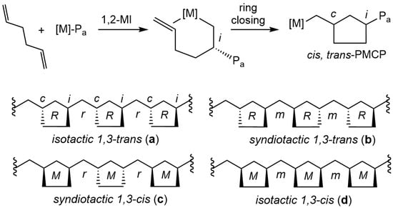 (top) Two-step propagation of coordination polymerization of 1,5-hexadiene to produce PMCP; (bottom) four limiting stereochemical forms for cis and trans PMCP.