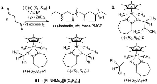 - Wallace, M.A.; Zavalij, P.Y.; Sita, L.R. Enantioselective living coordinative chain transfer polymerization: Production of optically active end-group-functionalized (+)- or (–)-poly(methylene-1,3-cyclopentane) via a homochiral C1-symmetric caproamidinate hafnium initiator. ACS Catal. 2020, 10, 8496–8502. [Google Scholar] [CrossRef]