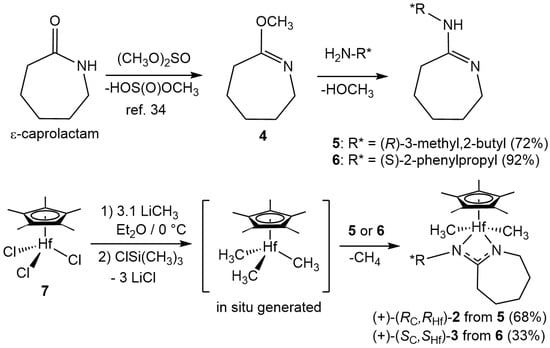 Scheme 3 presents the synthetic methods that were used to obtain the new CPAM hafnium complexes, 2 and 3, in a manner analogous to those used to produce 1 [,,]. To begin, the O-Me lactim intermediate 4 was obtained from ε-caprolactam by the procedure originally reported by Benson and Carins [,]. Subsequent condensation of 4 with commercially available (−)-(R)-2-amino-3-methylbutane and (+)-(S)-β-methylphenethylamine provided the new homochiral caproamidines, 5 and 6, respectively, in excellent isolated yields. The desired CPAM hafnium derivatives, 2 and 3, were then obtained in moderate yields by protolytic addition of the caproamidines to Cp*HfMe3 (7) that was generated in situ from commercially available Cp*HfCl3 (8) and a slight stoichiometric excess (3.1 equivalents) of methyllithium according to Scheme 3. As noted, we have found that higher yields can be achieved by the addition of chlorotrimethylsilane (ClSiMe3) after the methylation step, which serves to quench any basic impurities that can catalyze decomposition of 7 prior to the addition of the amidine. Characterization of the new crystalline CPAM hafnium complexes, 2 and 3, by 1H and 13C NMR (400 and 100 MHz, respectively, toluene-d8) spectroscopy provided spectra consistent with the structures depicted in Scheme 2b. Most notably, observation of only a single set of two resonances for the diastereotopic methyl groups bonded to Hf provided strong evidence that a single diastereomer had been produced in each case (see Figures S5 and S7 in Supporting Information). This conclusion was further supported by conducting variable temperature 1H NMR spectroscopy between the temperatures of 25 °C and 90 °C that revealed the barriers to ‘amidinate-ring-flipping’ epimerization of the transition metal center to be sufficiently high enough to confer configurational stability of 2 and 3.
