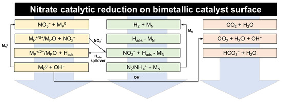 Mechanism for NO3− catalytic reduction on the surface of the supported bimetallic catalyst [92].