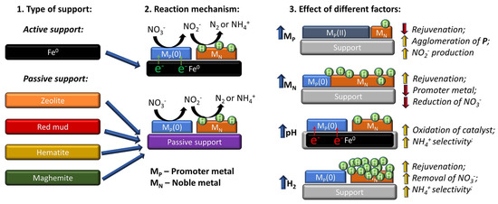 Generally, the removal kinetics of NO3− and consequently, its selectivity towards N2 formation, depends on the experimental conditions of the reaction, such as NO3− concentration, solution pH, H2 flow, and the catalyst used [92]. Regarding the catalyst, several properties influence its activity and selectivity, such as the chosen support material, the promoter and noble metal used, as well as its content [92,97].