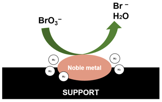 In this way, the most efficient approach consists of the application of monometallic catalysts, mainly composed of noble metals, supported on adequate support materials for BrO3− catalytic reduction. As previously mentioned, the material used as support for the metal active centers plays an important role in the catalytic activity of these catalysts (regardless of the catalytic reaction). Over the past few years, most of the research conducted in this area has been associated with the study of more stable and active catalysts that would improve the catalytic conversion of this species [117,118,119].