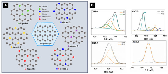 Schematic representation of heteroatom doping (N-, B-, N-S-, S-, P-, and F-) on a graphene structure (A) and XPS spectra results obtained for heteroatom-modified carbon nanotubes (B) [137,156]. Reprinted and adapted with permission from [137]. Copyright 2024 American Chemical Society. Insert appropriate information in place of the capitalized words.