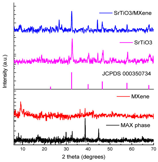 In the MXene, the broad peak indicated increased interlayer spacing. In the MAX phase (Ti3AlC2), shown in Figure 1, the XRD pattern of the MXene/SrTiO3 composite demonstrates that all the diffraction peaks of the composite perfectly match with the diffraction peaks of pure SrTiO3. This suggests that there was no structural difference in the SrTiO3 material during the process of depositing it onto the MXene.