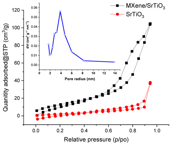 Nitrogen adsorption–desorption isotherms of SrTiO3 and the MXene/SrTiO3 composite inset shows the BJH pore size distribution of the MXene/SrTiO3 composite.
