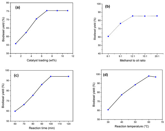 The quantity of the catalyst used is a critical factor influencing both the reaction rate and the yield of biodiesel production. The consequences, depicted in Figure 5a, demonstrate an early vertical incline followed by a sharp slant, indicating that the biodiesel production upsurges as the catalytic agent loading was raised from 1 to 11 wt%. The biodiesel yield of 75% was achieved at an optimum catalyst loading of 7 wt%, using the other constant conditions, i.e., the methanol-to-oil ratio of 9:1, the time of 60 min, and the temperature of 60 °C. Figure 5 further illustrates that beyond a certain point, increasing the catalyst concentration does not lead to any improvement in biodiesel yield. This suggests that the presence of excessive catalyst in the transesterification reaction results in a constant yield. This finding may be explained by a full saturation of the catalytic areas and a potential rise in the consistency of the reaction fluid [33,34].