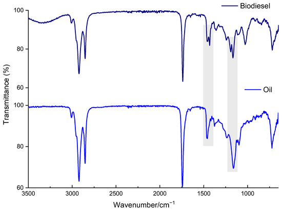 Functional groups present in the esters (FAMEs) can be detected by the fast and easy, advanced analytical technique of FTIR spectroscopy. Peaks were obtained in the range of 4000–400 cm−1. A small variation was observed in the composition of oil (Silybum marianum), and biodiesel (Silybum marianum biodiesel) band intensities and absorbance frequencies appeared to be relatively close (grey zone area), as shown in Figure 6. The most significant peaks indicate that the triglycerides presence in the oil was 1741 cm−1; in the ester group(s) (C–O), it was 2853 cm−1 (sp3 C–H), 2922 cm−1 (sp2 C–H), 1457 cm−1 (C–H), 1161 cm−1 (C–O), 1097 cm−1 (–CH2 in R–COCO–), and 722 cm−1 (C–H). The R1-C (OR)–O corresponds to the functional group of esters in oil, while the FAME ester group is signified by R1-C(OCH3)–O. The peaks appear at 1361 cm−1, 1435 cm−1, 1377 cm−1, and 1457 cm−1, showing the bending vibrational behavior of the (CH2 and CH3) presence in biodiesel and oil, respectively. In the FTIR analysis of the seed-extracted oil, there was an absence of the characteristic 1435 cm−1 peak, which signifies the conversion of the FAME group into biodiesel [6,45]. Similarly, the strong, broad signal at 1169 cm−1 in Silybum marianum oil separated into two concrete signals at 1170 and 1195 cm−1 in the biodiesel. All of the aforementioned interpretations demonstrate the confirmation of the production of biodiesel.