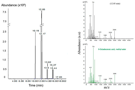 The biodiesel produced from the chemical composition of Silybum marianum oil was analyzed further by the GC-MS (Figure 8). The analysis of the biodiesel samples using library software (NIST02, version 2002) allowed for the identification of various FAMEs, as shown in Table 1. The mass spectrum was 9-octadecenoic acid methyl ester (retention time 12.05 min), which is an unsaturated fatty acid methyl ester. The mass spectrum shows important fragment ions characteristic of methyl ricinoleate. In addition to methyl ricinoleate, other saturated fatty acid methyl esters were identified, including the pentadecanoic acid methyl ester, the heptadecanoic acid methyl ester, the octadecanoic acid methyl ester, and the tetrasanoic acid methyl ester. Furthermore, unsaturated fatty acid methyl esters were also observed, such as the 7-hexadecenoic acid methyl ester and the 9-octadecenoic acid methyl ester. Characteristic peaks at m/z = 109 and 143 in the mass spectra are attributed to β-cleavage. McLafferty rearrangements were also observed at m/z = 74 in both the saturated and unsaturated spectra.