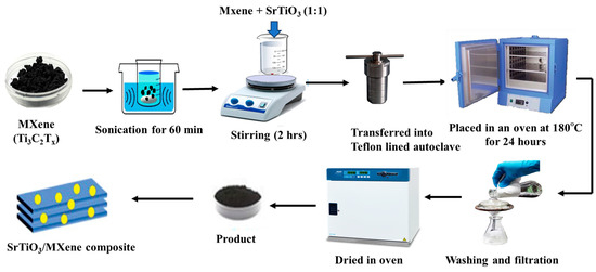 The hydrothermal method was employed to prepare MXene/SrTiO3. This process, which has been reported previously [55], was adopted for this study. Initially, 1.0 g of MXene was added in a solution of ethanol (80 mL) through ultrasonication for 2 h. Then, the as-prepared SrTiO3 was put into the solution to synthesize the Ti3C2/SrTiO3 (1:1) nanocomposite catalytic agent. After 2 h of stirring, the prepared solution was moved to a Teflon-lined autoclave reactor and maintained at a temperature of 120 °C for 24 h to complete the reaction. Once the reaction was finished, the mixture was dried in an oven at 80 °C for 2 h (Figure 11).