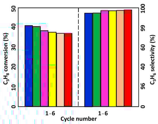 A nanometric Pt-Mn material was prepared via a combination of surface organometallic chemistry, as well as thermolytic molecular precursor approach, and subsequently supported on silica via the consecutive grafting of Mn, as well as Pt, precursor on surface OH groups. In the prepared catalyst, Mn is mainly present as a single site on the support surface; only almost 30 wt% of Mn is incorporated within segregated Pt2Mn nanoparticles []. The prepared material displayed high robustness: after six regeneration cycles, a propane conversion of almost 37%, along with a propane selectivity of almost 98%, was still recorded at 550 °C (Figure 2).
