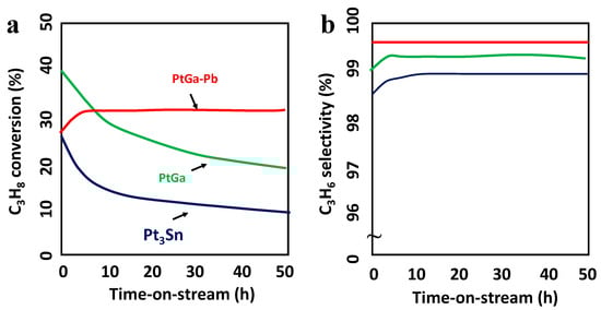 Propane conversion (a) and propene selectivity (b) as a function of TOS over PtGa/SiO2, PtGa–Pb/SiO2 catalysts; gas feed: C3H8:H2:He = 3.9:5.0:40 mL min−1 at 600 °C; exposed Pt: 4.5 µmol [].