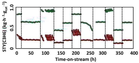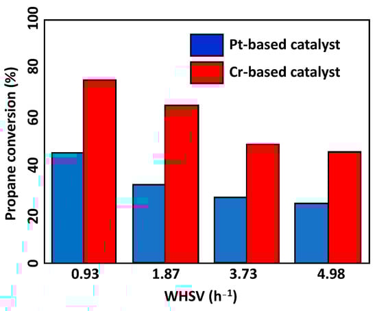 Song et al. [] tested two catalysts (Pt-based and Cr-based formulations) in a fluidized bed reactor at 650 °C by changing the WHSV in the interval 0.93–4.98 h−1: both the samples (Figure 8) displayed an increase in the conversion rate with the reduction in reactants concentration. However, at every selected space velocity, the Cr-based catalyst showed enhanced activity, with a considerable reduction in the operative costs.