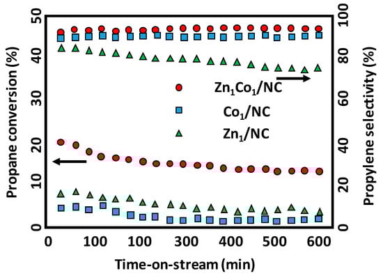 Compared to single-atom catalysts, dual-atom samples are expected to facilitate the adsorption/desorption of the substrates during PDH reaction []. In this regard, Chai et al. [] prepared a hetero-dual atom catalyst with Zn1Co1 phases anchored on N-doped carbon (Zn1Co1/NC) by a competitive complexation strategy; the sample was tested under a C3H8/H2/He = 5:5:90 stream at 600 °C and a space velocity of 0.2 g∙s∙cm−3. Figure 5 compares the performance of the novel catalyst with respect to the single-atom formulations (Zn1/NC and Co1/NC). Zn-containing samples displayed increased C3H8 conversion, while Co presence enhanced the C3H6 selectivity. In fact, the bridged N atoms between Zn1 and Co1 were able to promote the C-H bond scission in propane molecule while the N-colligated Zn1Co1 ensemble with its dynamically changing structure offered a feasible channel for the desorption of C3H6.