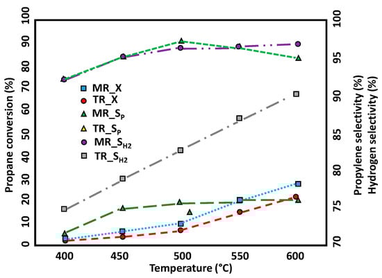 PDH performances in a traditional reactor (TR) and membrane reactor (MR) reported in terms of propane conversion (X), propylene selectivity (Sp), and hydrogen selectivity (SH2) over a Pt-Sn/Al2O3 catalyst and in the presence of a Pd-Ag membrane [].
