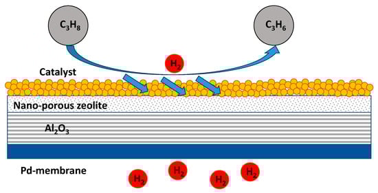 Almallahi et al. [] designed a reactor for the propane conversion to propylene in which a Pt-Sn/SiO2 catalyst is packed in the inside wall of a hollow-tube silica–alumina hydrogen membrane. This integrated system allowed for achieving propane conversions > 140% of the thermodynamic conversion and a C3H6 selectivity higher than 98% with no deactivation of the system components.