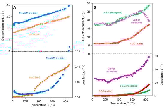 Dielectric properties: (A) fresh and spent catalytic Mo/ZSM-5 powders (for MNOC process); (B) carbon nanotubes and SiC powders (100–250 µm) with different crystalline phases (cubic and hexagonal) [].