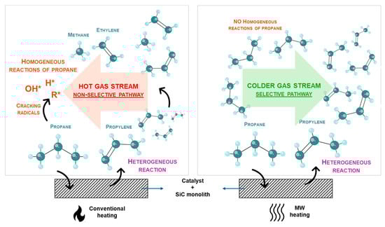 As depicted in Figure 10, a comparison between microwave heating and conventional heating at 600 °C revealed differences in product distribution. Specifically, the authors [] demonstrated that the formation of ethylene and methane was significantly reduced under microwave heating. This reduction was attributed to the temperature difference between the gas and solid phases, which disfavors the homogeneous pathways (see Figure 11). Consequently, there was a substantial increase in propylene selectivity when transitioning from conventional heating to microwave heating technology.