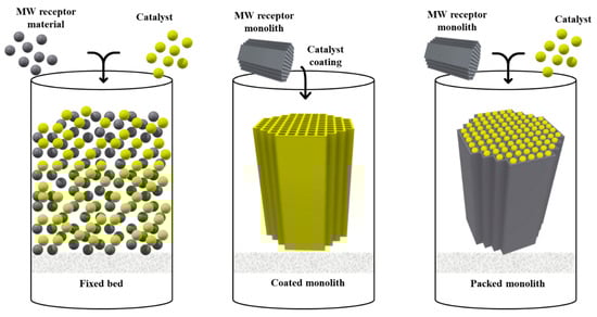 The PDH reaction has been explored in various solid–fluid reactor configurations for microwave heating, including fixed beds, coated monoliths, and packed monoliths (Figure 12) [,]. Fixed beds, a classic configuration, utilize pellets composed of a microwave-absorbing material like SiC mixed with the catalyst. However, contact points between particles can lead to hot spot formation and arcing, particularly aggravated by coke deposition, a common PDH byproduct []. This makes process control challenging. To address these issues, coated monoliths offer lower pressure drops and enhanced heat and mass transfer. SiC monoliths or open-cell foams (e.g., SiC or cordierite) can serve as both microwave receptors and structured catalyst supports []. While advantageous, coated monoliths have a significantly lower catalyst inventory compared to fixed beds, limiting the amount of catalyst that can be loaded []. Packed monoliths involve filling monolith channels with catalyst pellets []. This configuration allows for a large catalyst inventory while using a highly conductive and microwave-susceptible material. Nevertheless, similar to fixed beds, hot spot formation remains a concern.