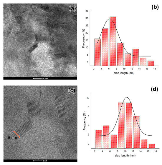 The distribution of the metal sulfides is crucial in determining their activity and selectivity under the reaction conditions. The HRTEM images of the sulfided NiMo catalyst shown in Figure 2 revealed the dispersion of the active NiMoS2 phase. The average slab length (LA) was calculated to be 6.1 and 10.4 nm and was taken in two different image locations, and the average stacking layer number (NA) of the NiMoS2 particles was found to be 6.0 and 9.5. The reaction pathways of the sulfided NiMo catalyst are known to be related to the lamellar length and stacking layers of the NiMoS2 active component. The shorter slab length and more stacking layers have proven to favor direct desulfurization and hydrogenation activity over the NiMo-Y zeolite catalyst (LA = 9.9–10.7 nm, NA = 3.7–5.2) [23]. This trend was also the same for hydrotreating BPE on a NiMo-USY zeolite (LA = 4.1 nm, NA = 4.2) [22]. A shorter slab length can produce more sulfur vacancies, which favor the reaction; on the contrary, more stacking layers could result in the aggregation of the active NiMoS2 components with higher hydrogenation activity.