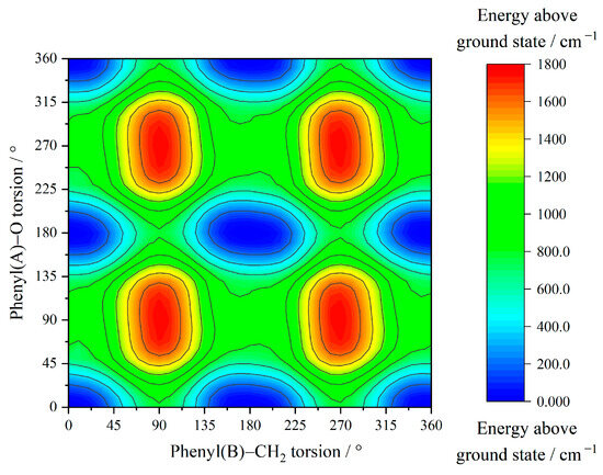 As far as we are aware, there are no reported assignments of either the structure or the vibrational spectra of BPE. Thus, as a first step to understanding the interaction of BPE with the catalyst’s surface, we have carried out a comprehensive investigation of the two-dimensional potential energy surface (2D PES) of BPE and its vibrational spectra. Figure 3 shows the BPE 2D-PES as a function of the torsions about the phenyl–O and phenyl–CH2 bonds.