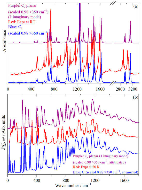 It can be seen that in both cases, the C1 conformer provides a better match to the experimental data, this is most apparent in the 0–500 cm−1 region. In particular, in the infrared spectrum, the band at ~500 cm−1 and in the INS the pattern of bands in the 200–400 cm−1 range are in much better agreement with the data. It should be noted that the calculations are for an isolated, i.e., gas phase, molecule, whereas the experimental spectra are for the solid state, showing that the conformation is the same in both phases.