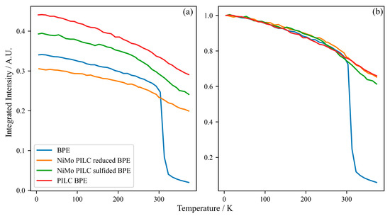 In addition to the vibrational studies using INS, we also investigated the effect of sulfidation of the NiMo-PILC towards the dynamics of BPE using QENS, and the results are shown in Figure 7. The measurements performed were those for PILC with adsorbed BPE (red), NiMoPR with adsorbed BPE (orange), NiMoPS with adsorbed BPE (green) and pure BPE (blue). A comparison of these measurements has enabled us to see the effect of the sulfided metal on the diffusion, allowing a distinction between motion on the support and on the NiMo component. For each sample, we measured an elastic window scan from base temperature (10 K) to 373 K (BPE melts at 313 K and boils at 559 K). The results of normalized data at 350 K reveal that more motion was observed for the BPE adsorbed on the sulfided NiMoPS catalyst when compared to that adsorbed on PILC and the reduced NiMoPR catalyst, which promotes the higher activity of NiMoPS for the HDL reaction.