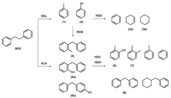 Various catalysts based on noble metals such as supported Ru, Pd, and Pt catalysts have been reported to be effective for cleaving the C-O bond of BPE [5,6,7,8], but their high price and low abundance make them unfavorable for large-scale industrial production. Heteropoly acids, metal oxides, and modified kaolinite clay have been studied, [9,10,11]; however, exploration of a more affordable and efficient route for selectively cleaving BPE to aromatics under mild conditions is highly desirable. The more economically viable base metal catalysts, such as carbon-supported Ni [12,13] and Fe or PdFe catalysts, on various supports [14,15] have been reported for the hydrogenolysis of BPE but require further developments in the catalytic conditions. The use of H-donor solvents such as methanol, ethanol and 2-propanol via catalytic transfer hydrogenolysis conditions have been explored [16,17] as well as those in the aqueous/apolar phase [18], molten salt conditions [19], and alkali carbonates in superheated water [20]. Improvements in the HDL process have been attributed to effects, such as an increase in dispersion of the active phases, more adequate active phase–support interaction, acidity effects, and geometrical effects, resulting in greater exposure of the active sites, and, hence, increasing the overall catalytic activity and selectivity.